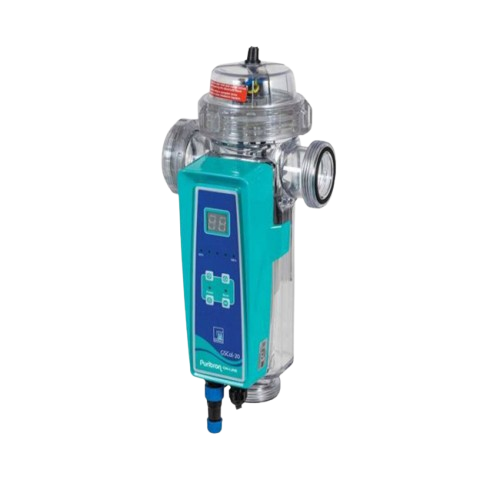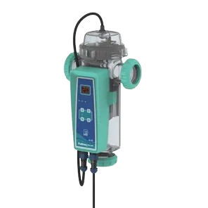 On-line salt chlorinator with self-cleaning titanium electrodes (14,000 hr life). Digital display, LED indicators, adjustable polarity (1–8 hrs), works with seawater; min salinity 4,000 ppm.